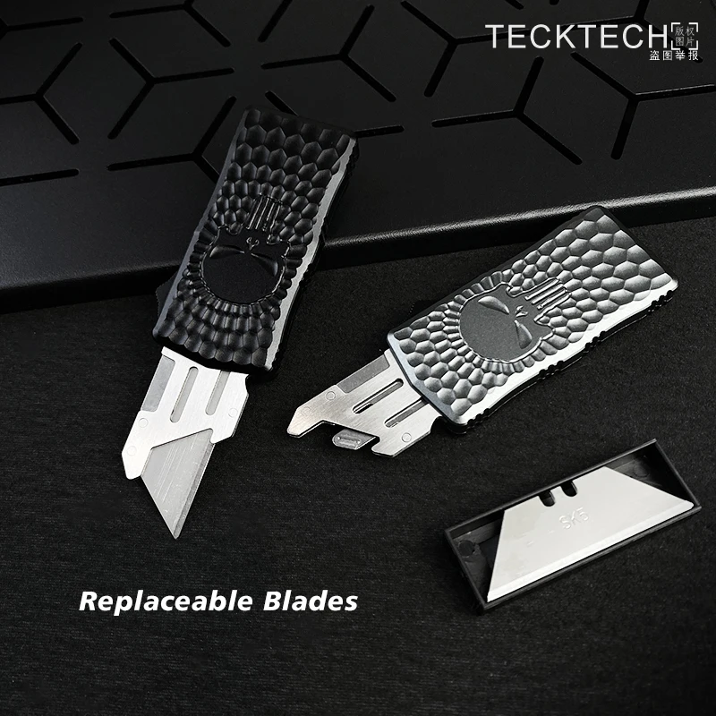 TECKTECH SKULL OTF Utility knife SK5 Carbon Steel Replaceable Trapezoidal Blade Paper Cutter EDC Cutting Tool Legal Pocket Knife CNC Aluminum PocketKnife